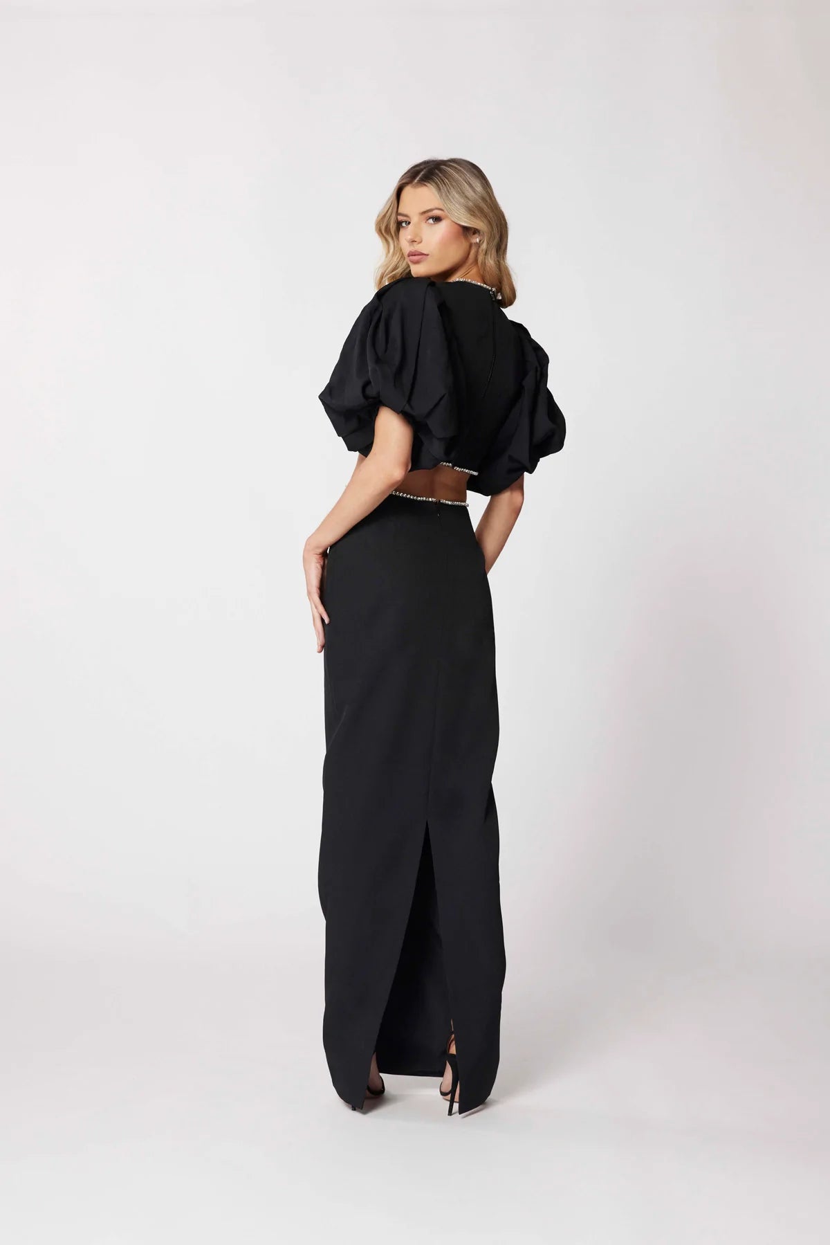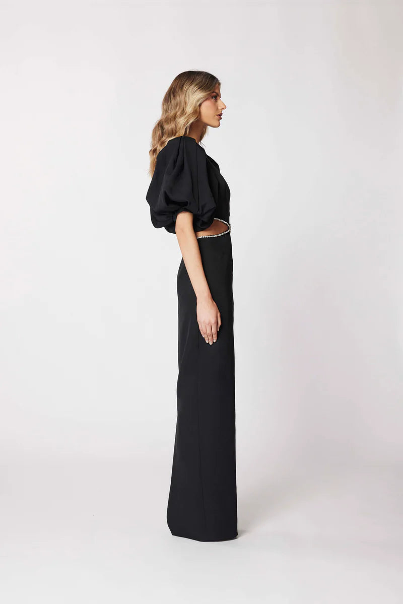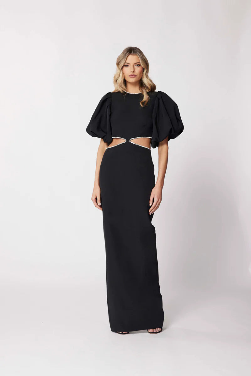 The Estelle dress will take your black-tie event to the next level. This dress features a soft balloon short sleeve, which is complemented by an embellished cutout waist detailing. The crystal detail provides a timeless and elegant look for your next formal event.