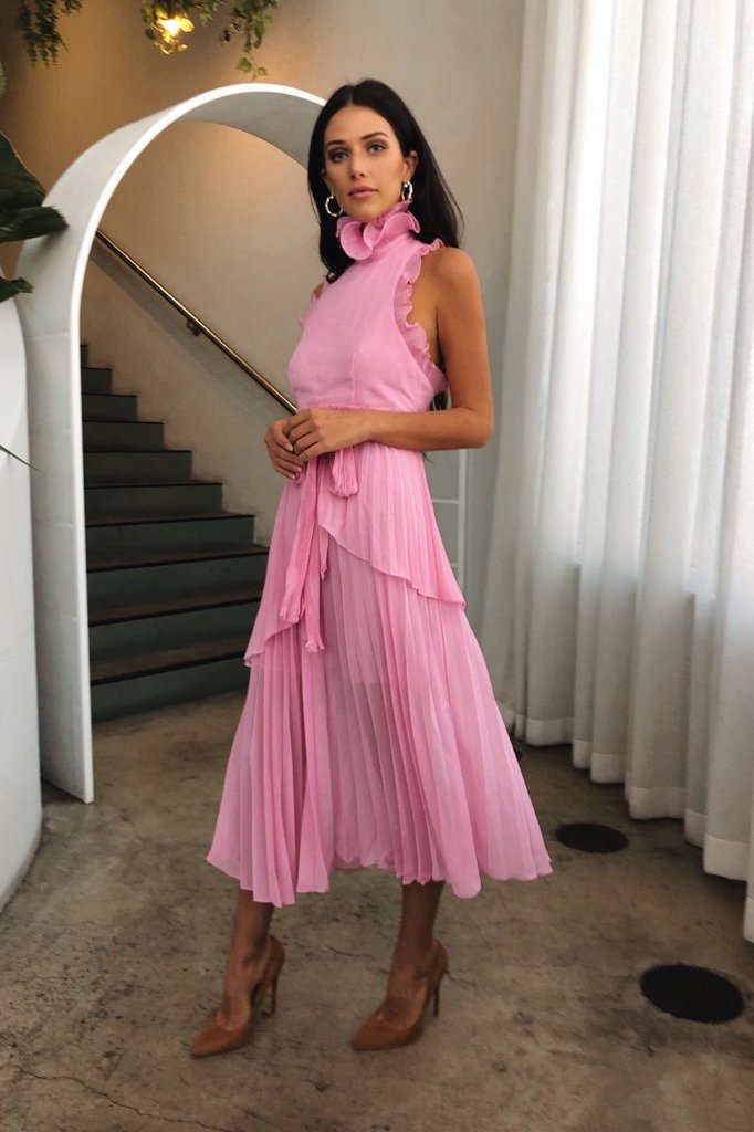 Designed with a chic high neck and intricately beautiful pleated frill detailing, which cascades down a racer-style back and around the armholes. Fitting closely on the bodice, the dress features a removable pleated belt, flaring out elegantly to an asymmetrical layered skirt with pleats. The piece falls gently past the knee.