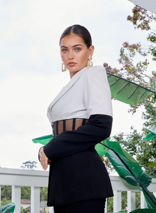 The Kira Blazer is part of the 'must have' power suit of the season. With bold contrasts of black and white, this tailored jacket features structured shoulder lines, a classic peak lapel and corset waist. Fully lined and fastened at the front with metal hook and eyes, this blazer is polished and refined, perfect for your next event.