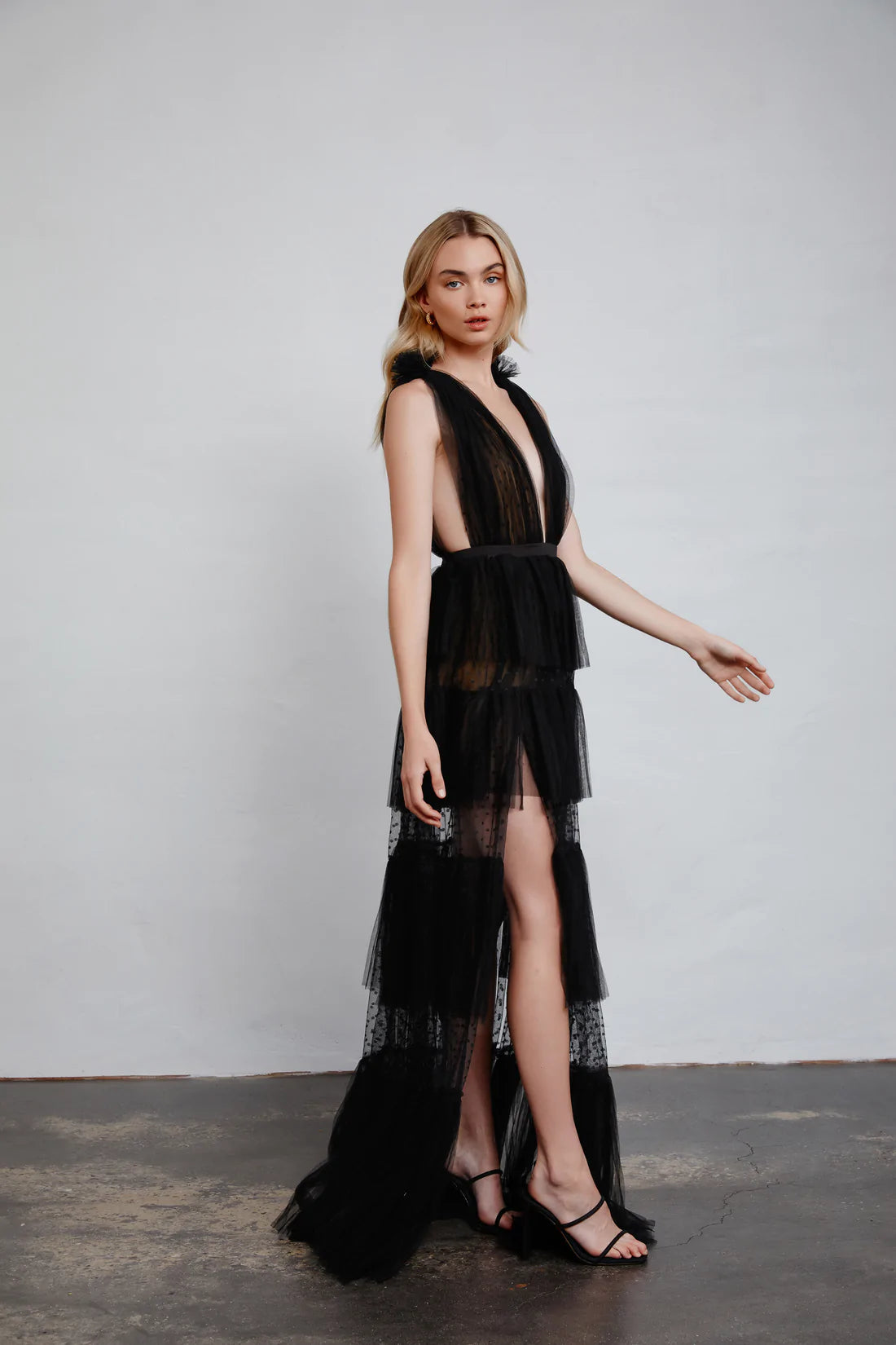 The Zendaya dress is a statement piece with layers upon layers of tulle that have been gathered and pleated to create the ultimate evening wear look. The bodice has a deep plunge which eventuates into a long tulle layered skirt with a thigh high split.